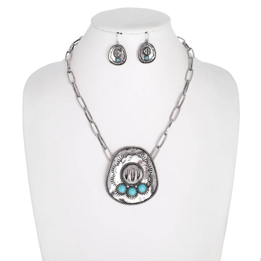 Large Semi Stone Cowboy Hat Pendant Chain Necklace Set