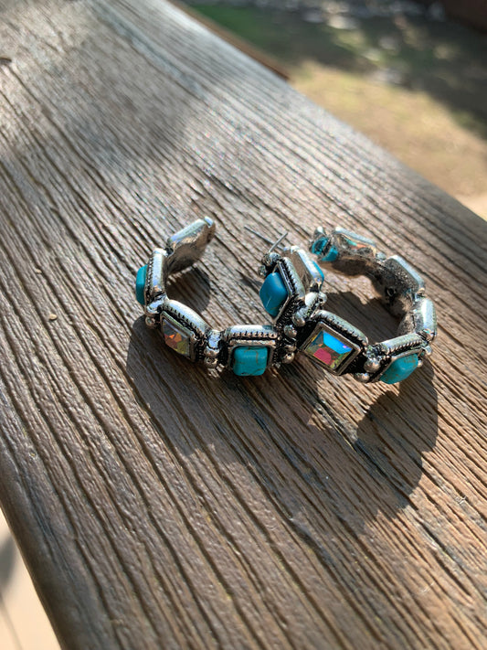 WESTERN GEOMETRIC TURQUOISE WITH RHINESTONE HOOP EARRING