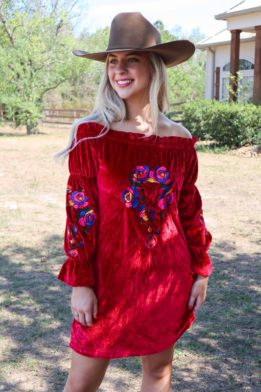 Sold outEmbroidered Velvet Tunic Dress - Red