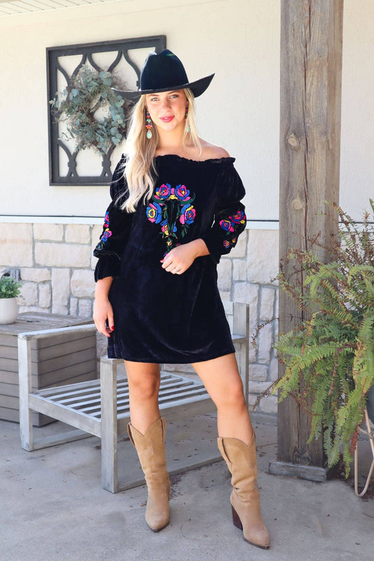 Embroidered Velvet Tunic Dress - Black